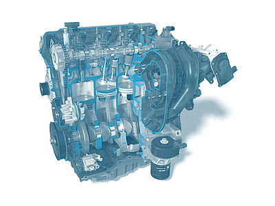During operation, the pressure generated by the combustion of an air/fuel mixture acts on the pistons, causing them to move up and down. This movement is transferred via a crank mechanism, consisting of connecting rods and a crankshaft, which converts the linear motion into rotational motion, ultimately driving the vehicle's wheels. Compared to the diesel engine, the petrol engine differs in its compression and ignition process. While a diesel engine relies on self-ignition due to high compression, petrol engine requires a spark plug for ignition (external ignition).